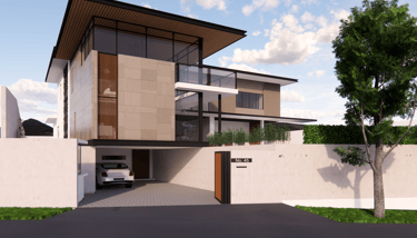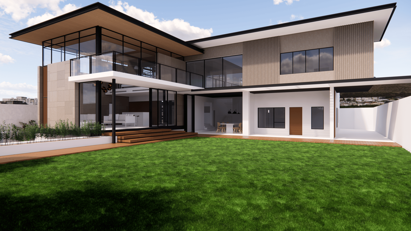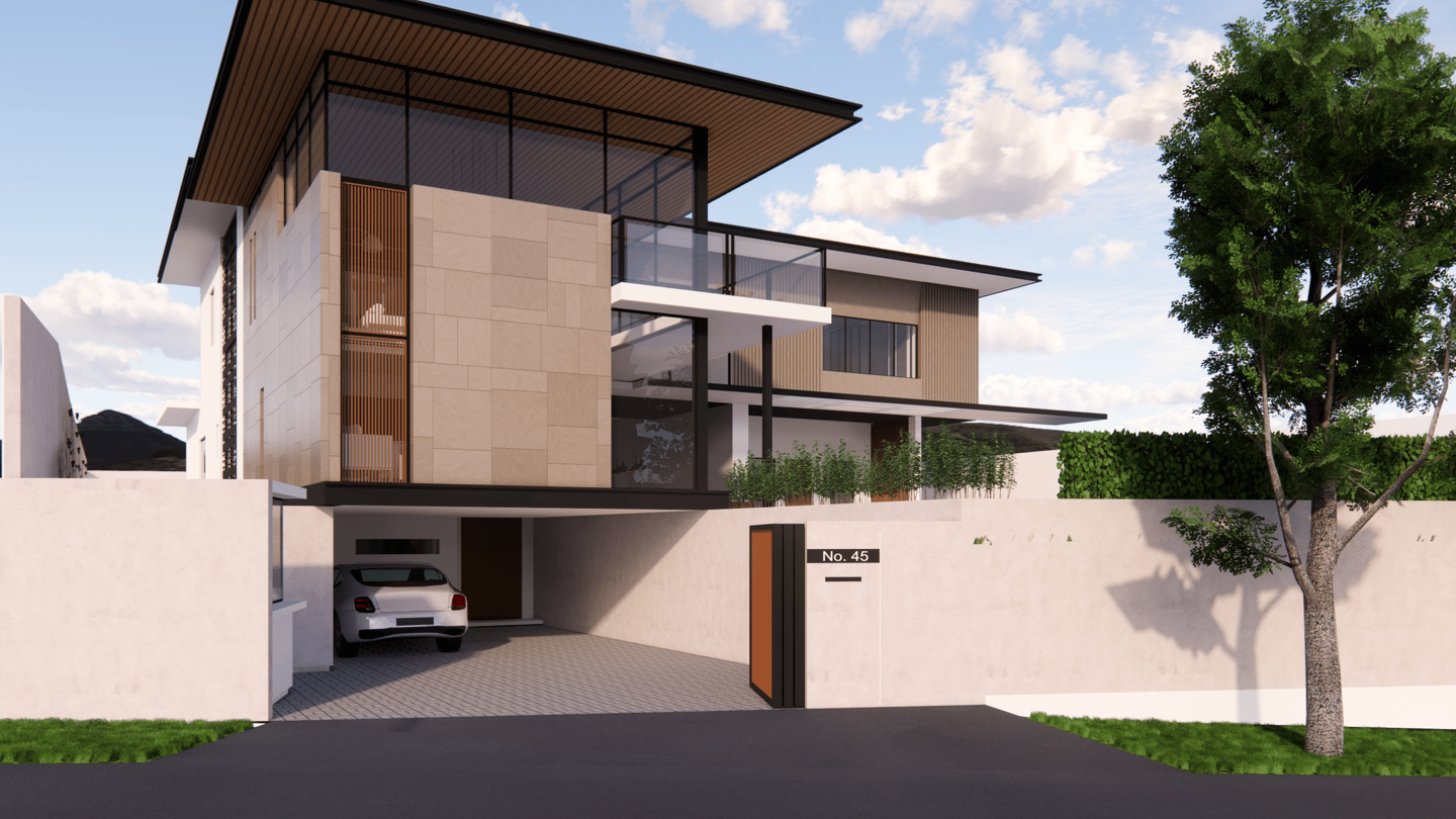 The double-volume living space extends seamlessly toward the garden, blurring the boundary between indoor and outdoor living. Each room is oriented to capture natural light and garden views, while deep overhangs and vertical fins provide shade and privacy. Balancing transparency and shelter, the design reflects a modern tropical lifestyle — calm, spacious, and deeply connected to its landscape.