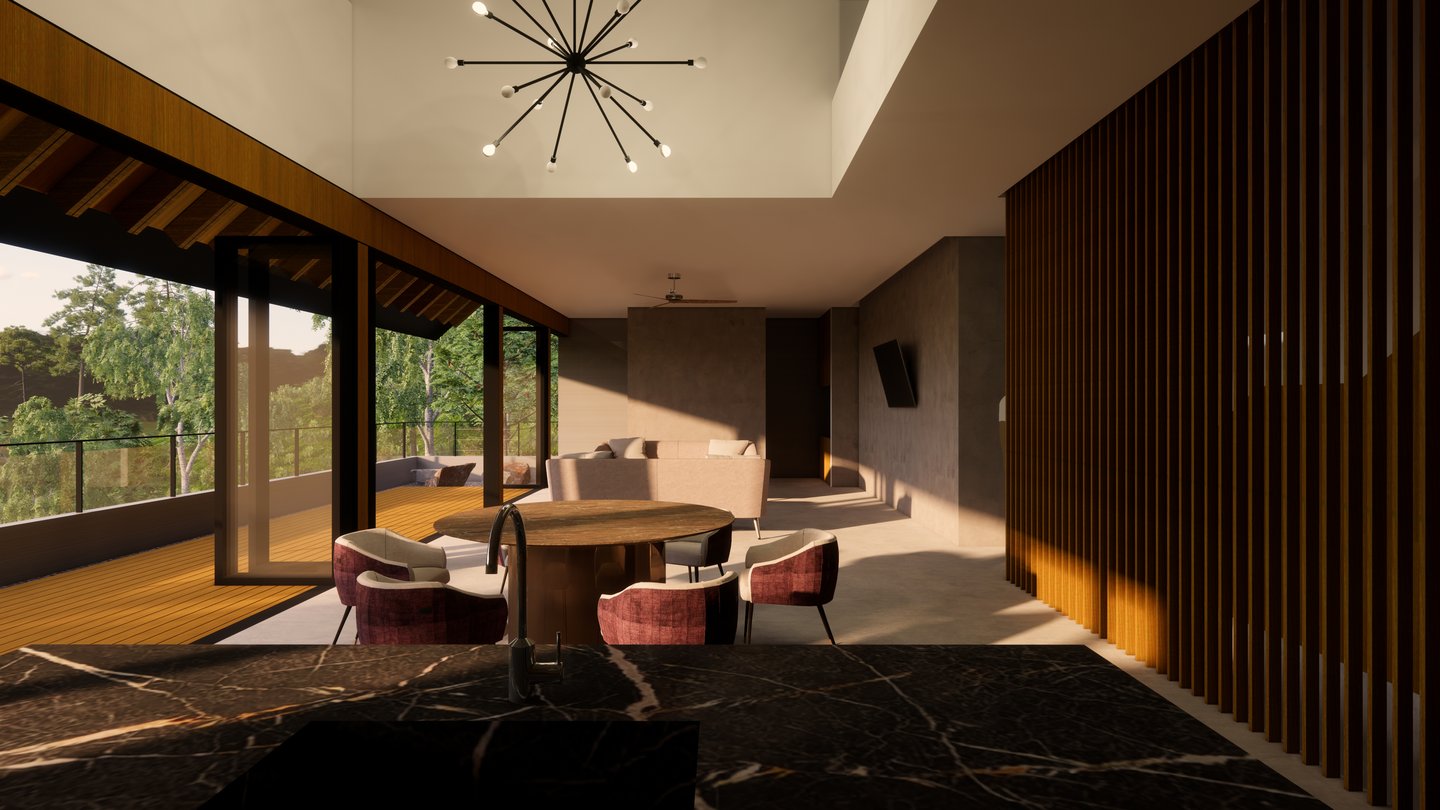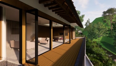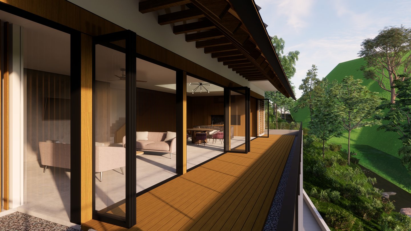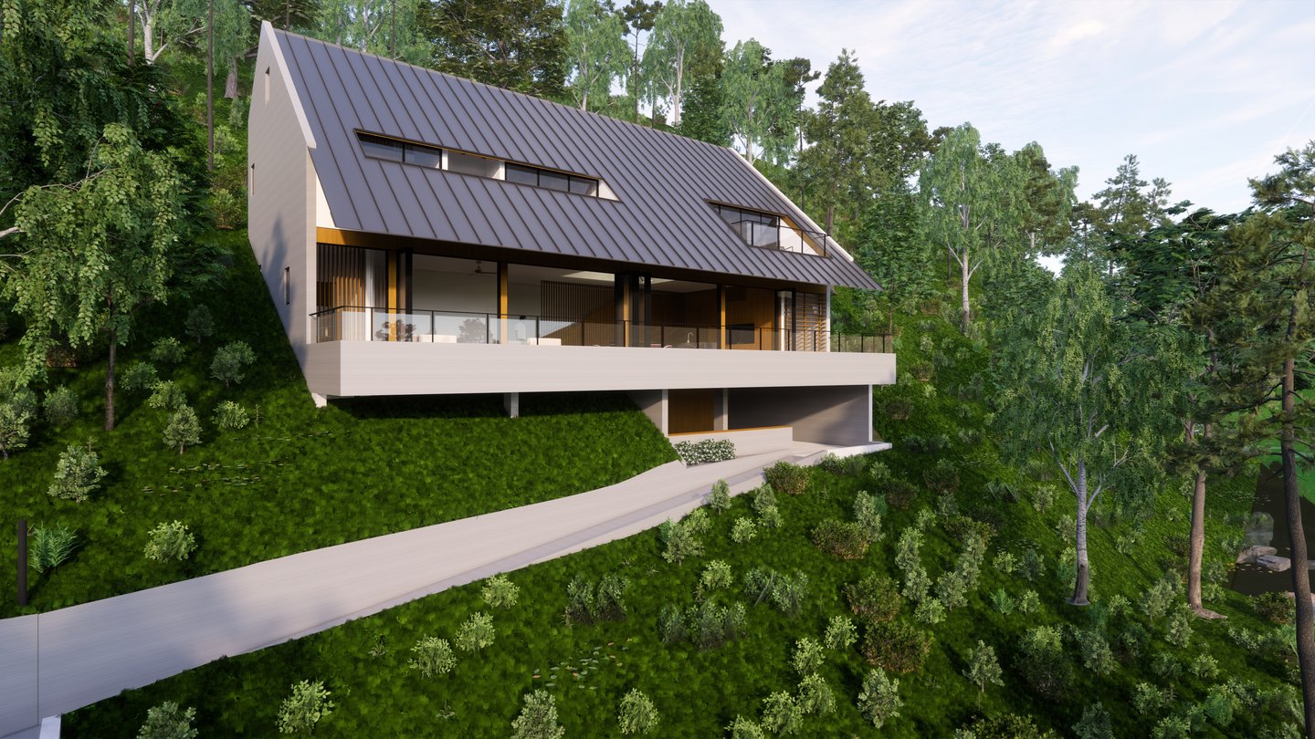 Nestled on a lush hillside surrounded by pine trees and native greenery, this villa proposal is designed as a quiet retreat immersed in nature. The home’s long, pitched roof and linear form follow the natural slope of the land, allowing it to sit gently within the forest terrain.