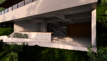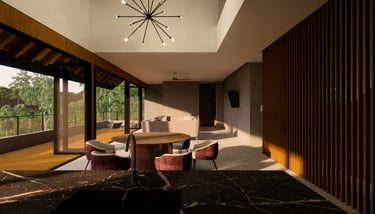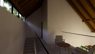 Large openings along the façade bring in natural light and ventilation while framing serene views of the surrounding canopy and stream below. Inside, warm timber finishes and textured concrete surfaces create a sense of calm and intimacy, balanced by open, flowing spaces that connect seamlessly to the outdoors. Every element  from the structural simplicity to the restrained material palette reflects the project’s intent to celebrate stillness, light, and the forest setting.